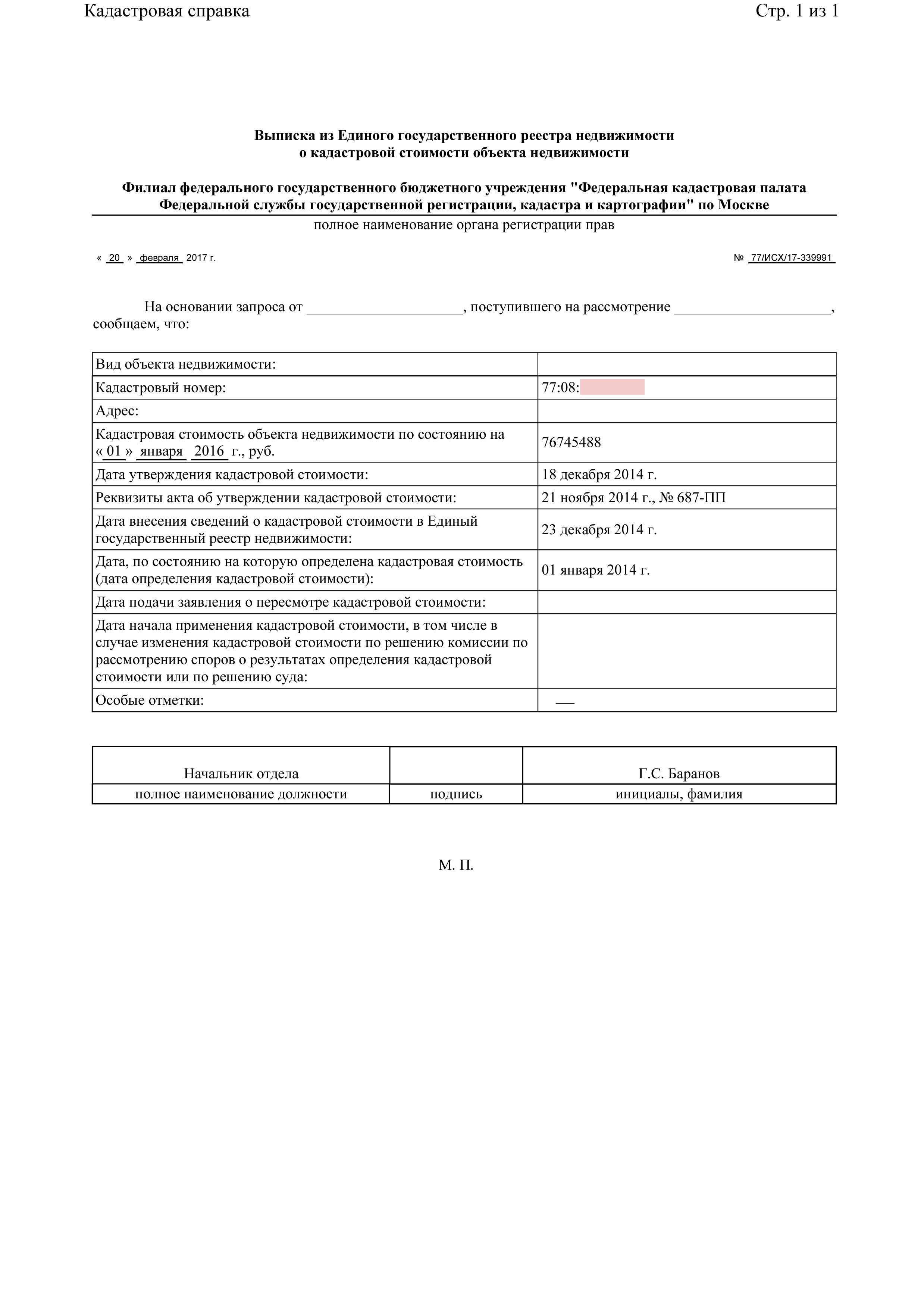 Образец заверенной выписки о кадастровой стоимости объекта недвижимости